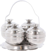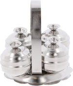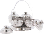 A complete Pooja Karanda holder. Crafted from high quality stainless steel, this 4 compartment karanda box with a base and handle to store essential pooja items such as kumkum, rice/chawal, chandan, haldi and other essential offerings, it serves as an ideal companion for Pooja ceremonies.
