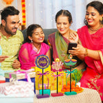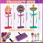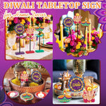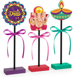 • Happy Diwali Party Decorations: This set of wooden stands features a double-sided printed design in red and green, and purple with a beautiful ribbon, perfect for Deepavali party decor.